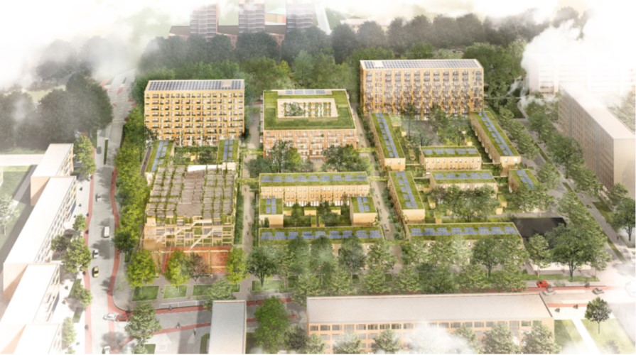 - In het midden van de bouwblokken komt een groot plein dat waar woningen omheen staan. Een plek waar geen auto’s komen, net als in de straatjes naar het plein. Op het plein is ruimte om te spelen en elkaar te ontmoeten.