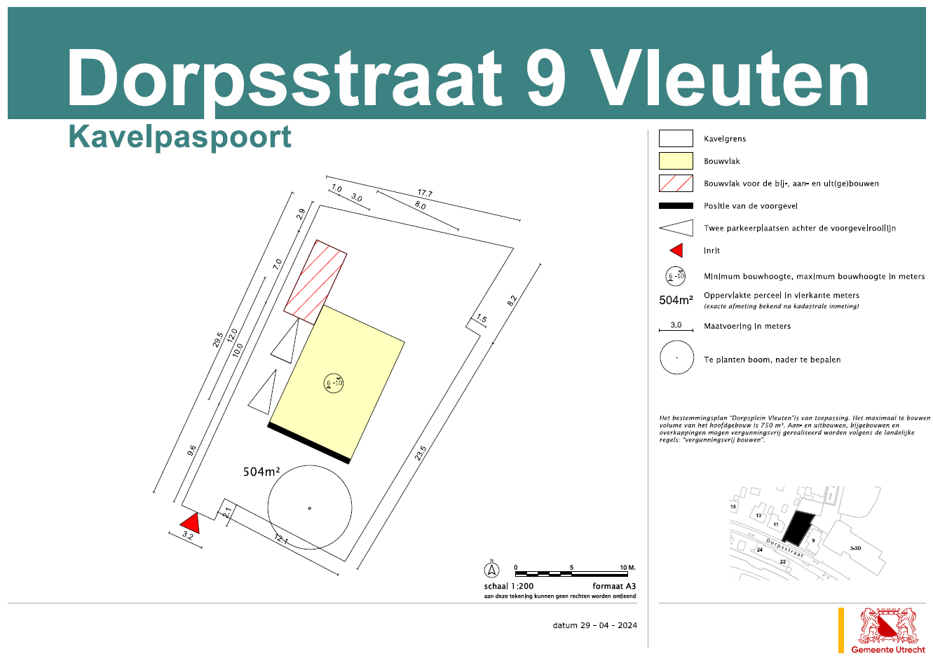 De kavel aan de Dorpsstraat ligt tussen nummers 9 en 11. En heeft een oppervlakte van 504 vierkante meter, ongeveer in de vorm van een rechthoek. Aan de kant van de Dorpsstraat is de kavel 15,3 meter breed. Aan de achterkant 17,7 meter. Gezien vanaf de Dorpsstraat is de linkerkant 29.5 meter lang. De rechterkant is 31,7 meter lang.