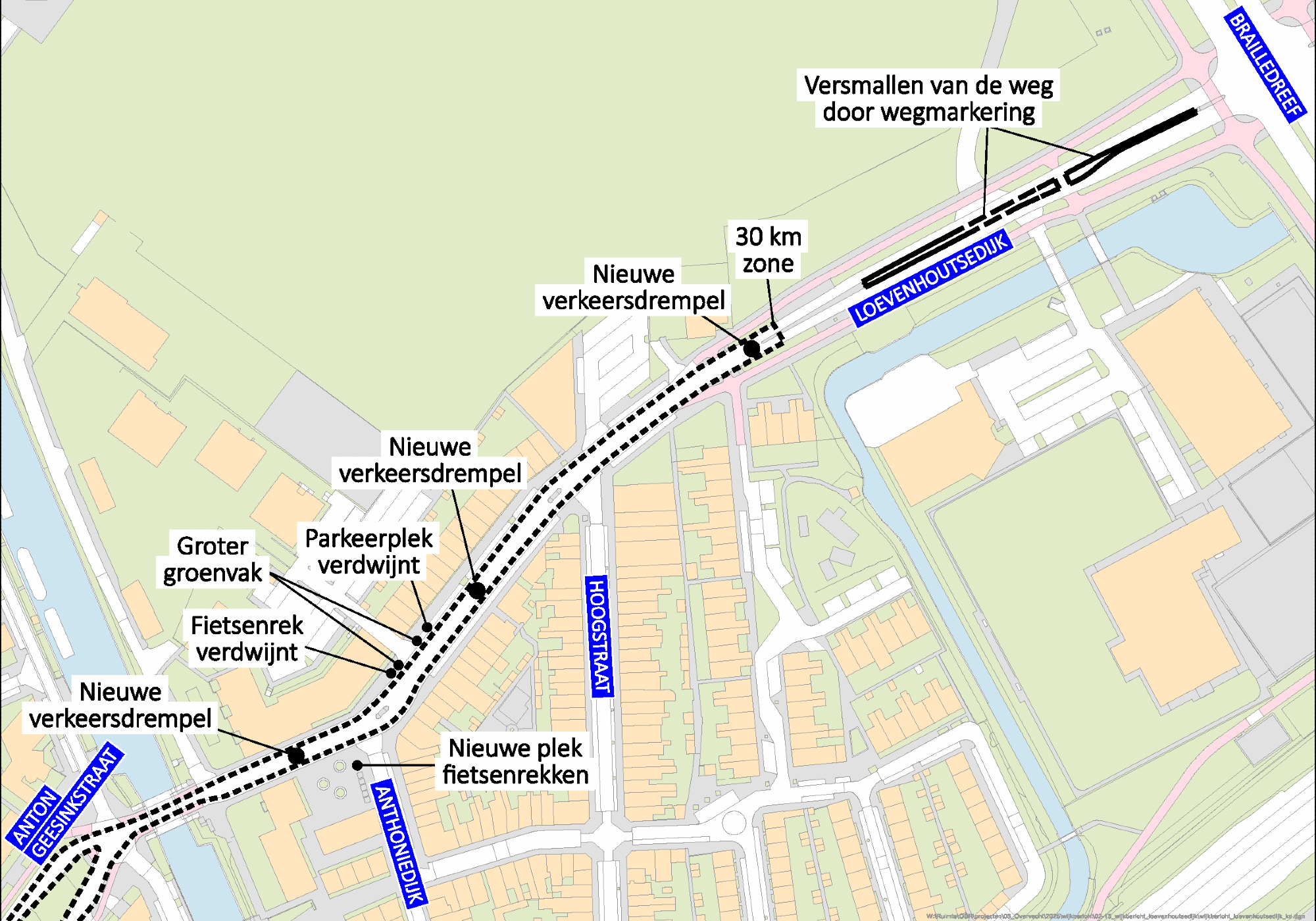 - Verplaatsen van het fietsenrek bij huisnummer 335 om meer ruimte te maken bij de uitrit. De nieuwe plek van het rek is aan de overkant van de straat, in de buurt van de Anthoniedijk