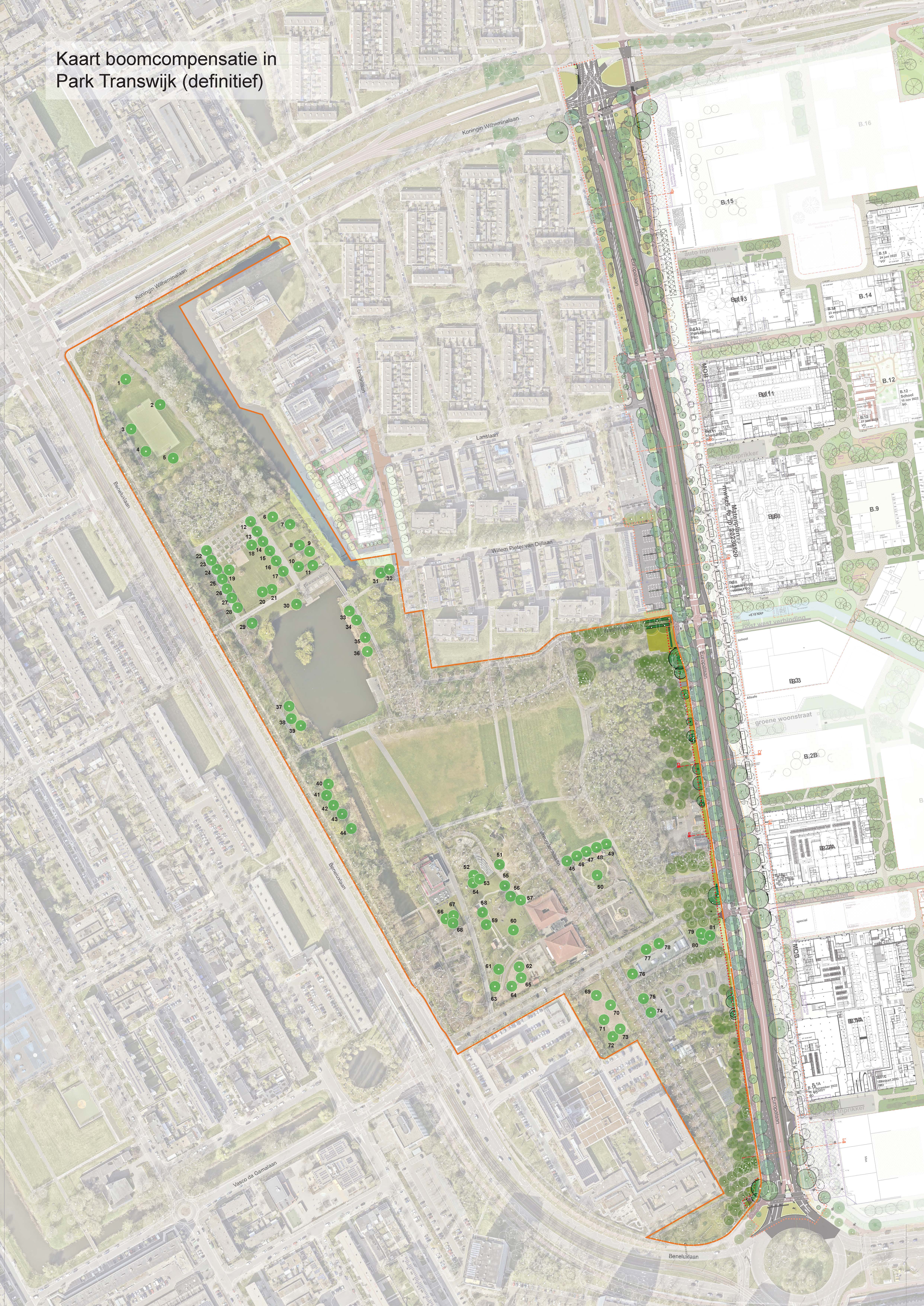 Voor elke boom die we kappen, planten we een nieuwe boom terug. In Park Transwijk is niet voldoende ruimte om alle 116 bomen terug te planten. We kunnen 81 nieuwe bomen terugzetten. Dat zullen we doen met verschillende boomsoorten en verspreid door het park. Het planten van de nieuwe bomen in het park nemen we mee bij het verbeteren van de inrichting van het park Transwijk. 35 bomen planten we terug in het Waterwinpark in Leidsche Rijn.