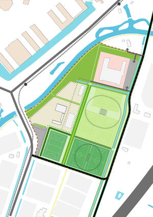 - Verplaatsing van de bestaande faciliteiten (clubhuis, kleedkamers, opslag en slagkooi) van cricket binnen het plangebied.