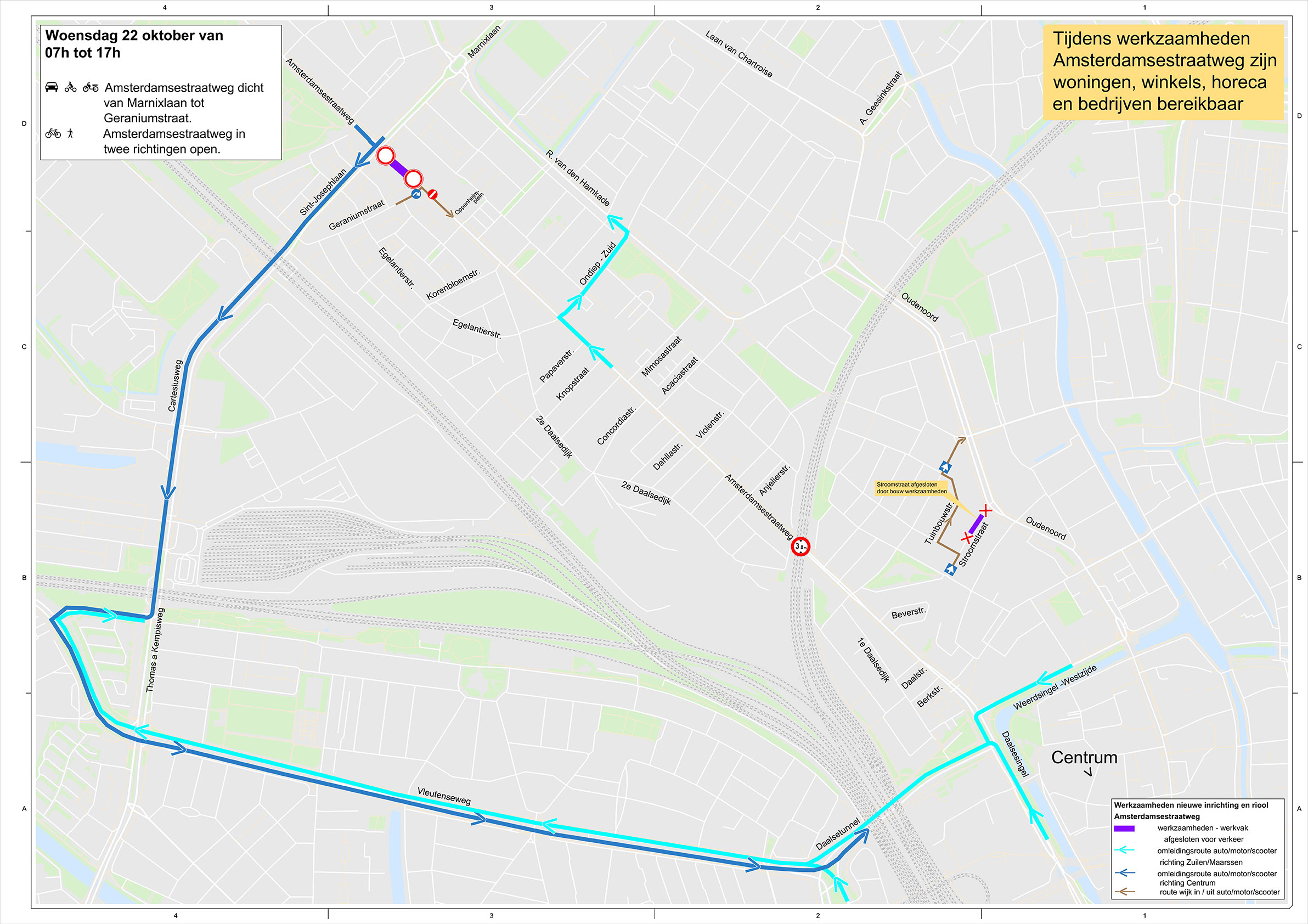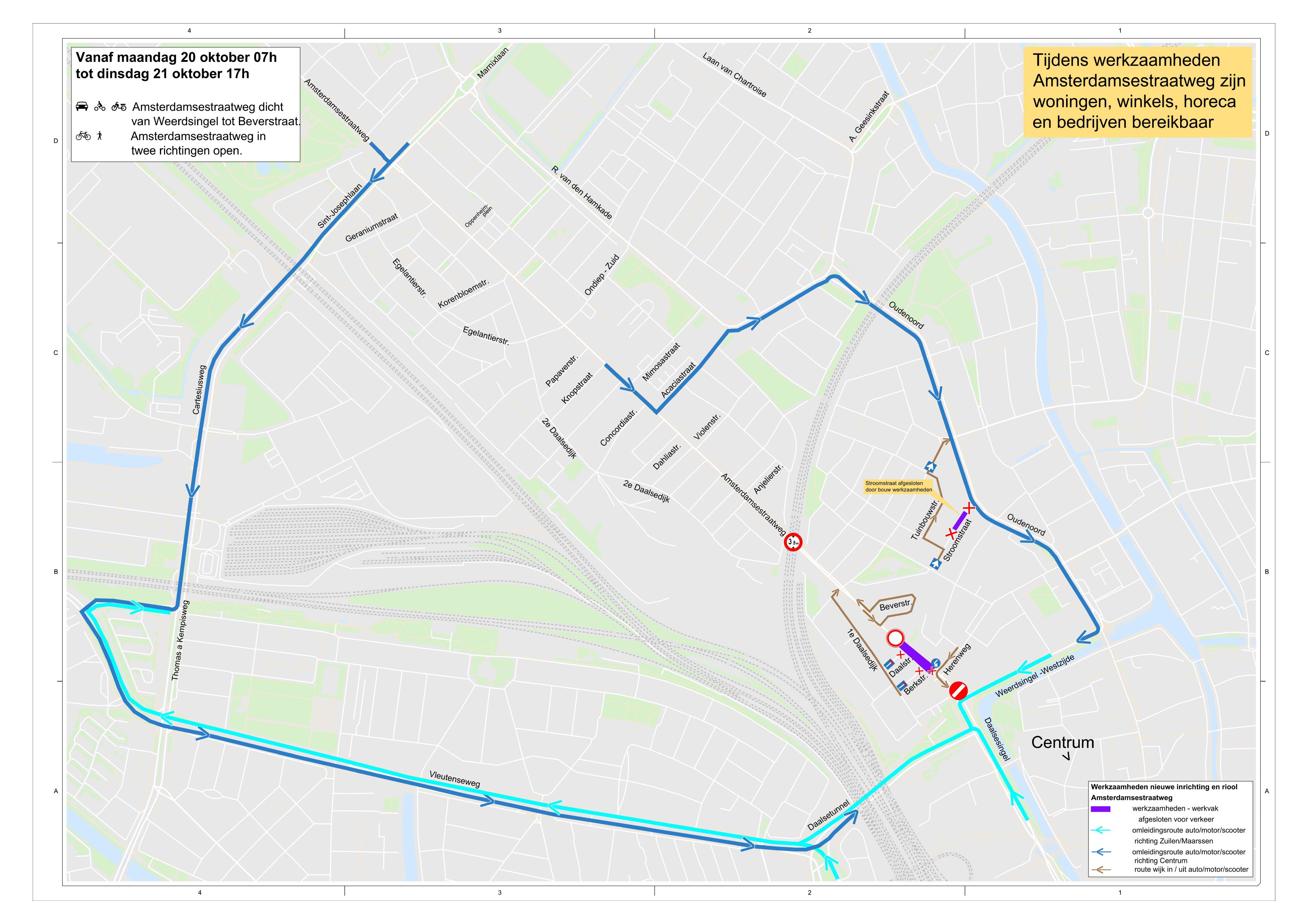 - Afsluiting Amsterdamsestraatweg voor autoverkeer tussen Marnixlaan en Geraniumstraat (richting centrum) en tussen Oppenheimplein en Marnixlaan (richting Maarssen).